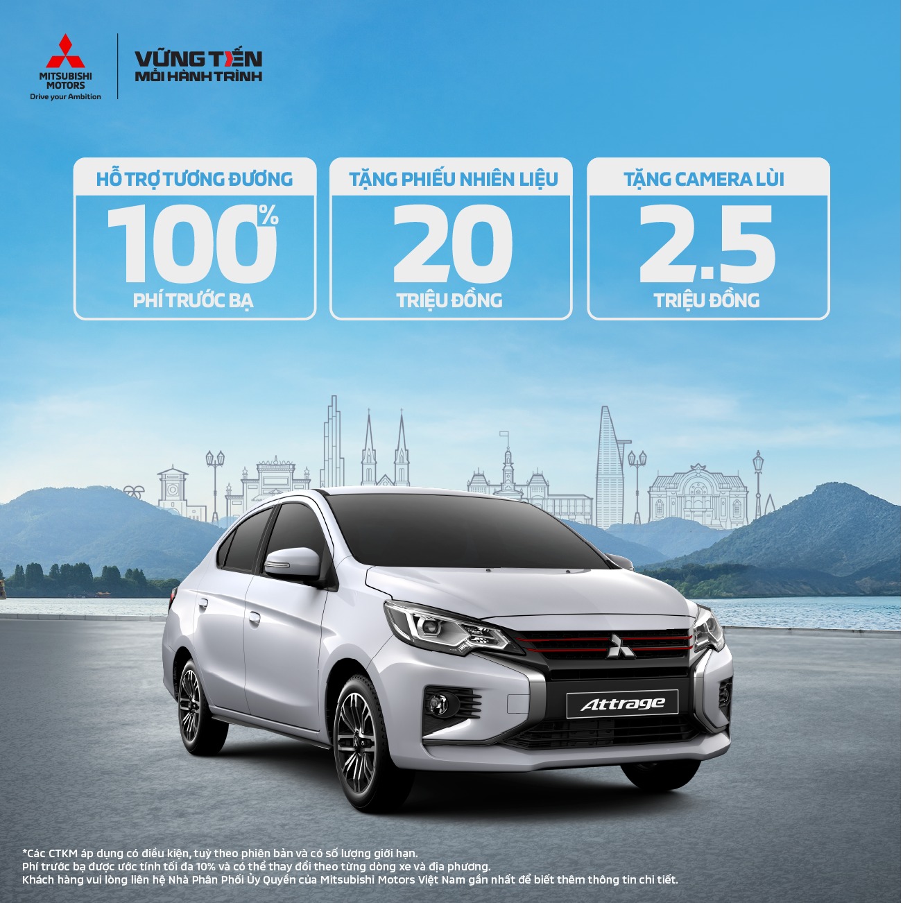 | Attrage | CVT Premium | Hỗ trợ 50% lệ phí trước bạ (24,5 triệu VNĐ), tặng phiếu nhiên liệu (20 triệu VNĐ), anten vây cá |