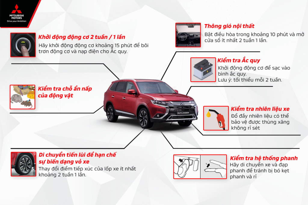 Khi bạn cần để xe ô tô trong thời gian dài không sử dụng, việc bảo quản đúng cách là yếu tố then chốt để đảm bảo xe luôn trong tình trạng hoạt động ổn định và bền bỉ theo thời gian. Dưới đây là hướng dẫn chi tiết từ Mitsubishi Bình Định giúp bạn chăm sóc “xế yêu” hiệu quả tại nhà, tránh những hư hỏng không mong muốn.
