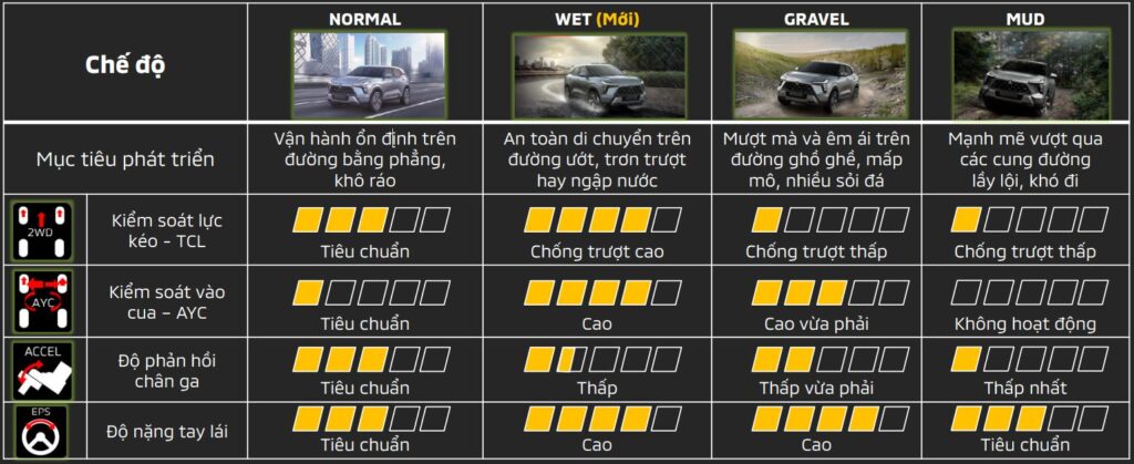 4 chế độ lái thông minh: Normal – Wet – Gravel – Mud, giúp thích nghi tốt với nhiều điều kiện địa hình.